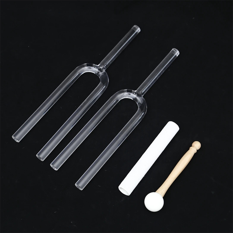 Våra stämgafflar i kristall är tillverkade av 99,99 % ren kvartskristall och är de finaste, orörda stämgafflarna i kristall. Den krossade kvartsen värms upp till minst 1800 grader i tillverkningsprocessen. Sedan testas de för att bestämma musiknoten. Även om de större gafflarna har en djupare, lägre oktavton, är det inte storleken som avgör gafflarnas 'ton'. Gafflarna är associerade med den musikaliska skalan, börjar med C, sedan D, E, F, G, A och B. Dessa toner är i sin tur associerade med de sju chakrana i det mänskliga systemet.